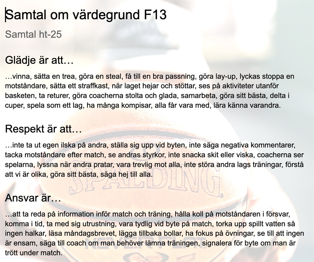 Bifogar bild på vårt uppdaterade värdegrundsdokument som är ett resultat från vårt frukostmöte i oktober. Många intressanta samtal med, och kloka synpunkter från våra spelare. Läs gärna tillsammans hemma!