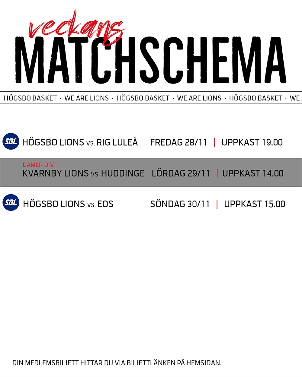 Det är som vanligt gratis inträde på alla div 1 matcher. Alla medlemmar under 19 år går även in gratis på ligamatcherna!