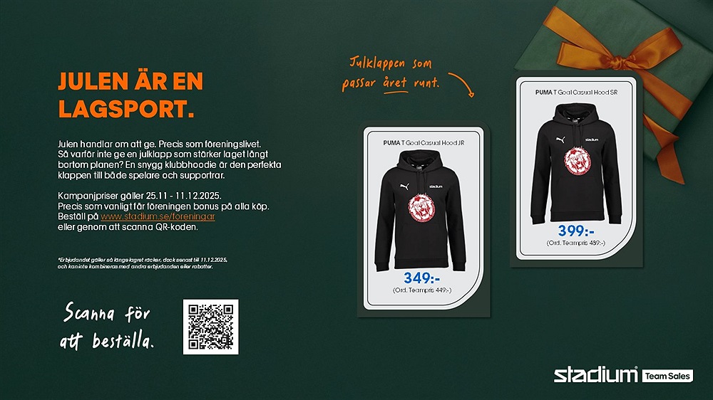 Scanna QR-koden och välj Högsbo Basket som förening. Där hittar ni allt ifrån hoodies som ni ser på bilden ovan, till väskor, byxor, jackor och liknande!